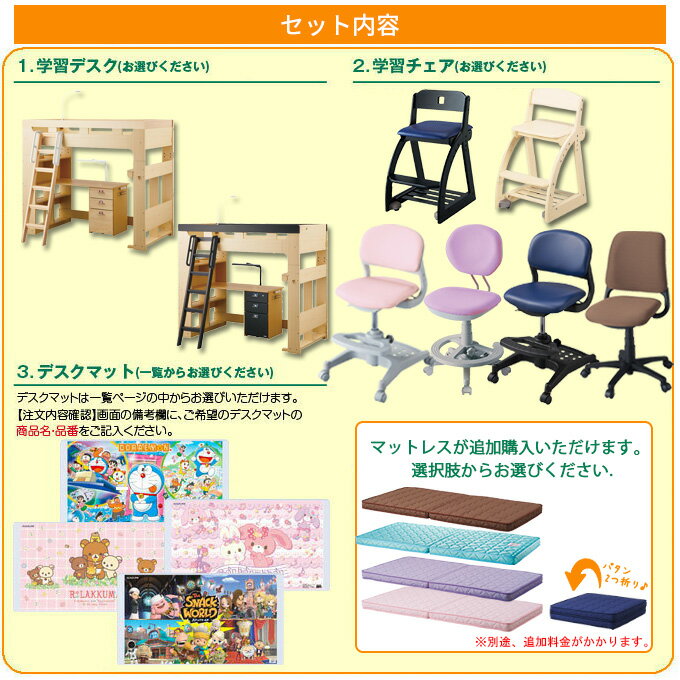 サイズ(cm) 【ハイベッドデスク】 W207.7×D102.8×H173.3 ◆床板高さ 142.9 ◆ベッド下空間 W165.4×D102.8×H134.8 ◇ベッド W207.7×D102.8×H53.9 ◇デスク W110×D55×H73 ○デスク天板高 73 ◇ハンガーラック W102.8×D27.4×H119.4 ◇シェルフ W102.8×D24×H119.4 ◇ハシゴ W38.4×D46.1×H153.7 ◇スノコ W98.8×D97.5×H4.3×2枚 【チェア】 ◆木製スクエアチェア W41.3×D49〜54×H75 座面高/44・47・50・53 ◆4STEPチェア(板座) W41.3×D49.5〜54.5×H74.5 座面高/42・45・48・51 ◆ジャストフィットチェア W48.4×D47.5〜55.5×H82〜93 座面高/42.5〜53.5 ◆ハイブリッドチェア W45.6×D52.5〜55×H76.5〜87.5 座面高/43.5〜54.5 ◆カデット回転チェア W56×D59〜61×H83〜94 座面高/42〜53 仕様 ◇LEDライト付き SB-611(WH)/SB-612(BK) 主材質 ◇デスク天板 ビーチ突板 他 ビーチ材、繊維板、プリント化粧板 ○ランドセルハンガー/コンセントボックス付 ※ハンガーラック、シェルフは内向き、外向きが選べます。